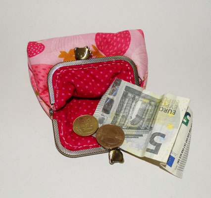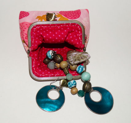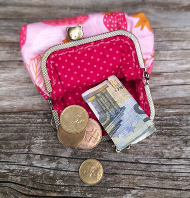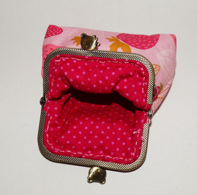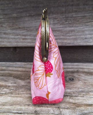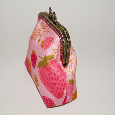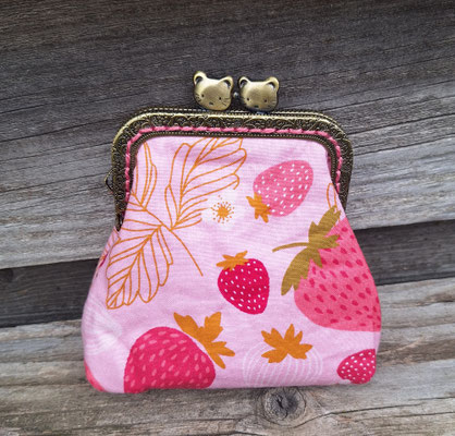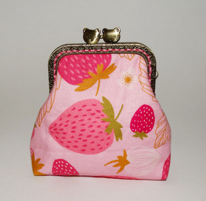 mignon porte-monnaie rétro pour femme, bourse vintage, tissu rose avec des fraises, fermoir métallique bronze avec des oursons, idée cadeau artisanale