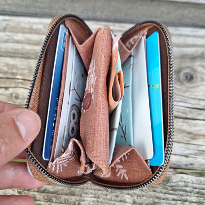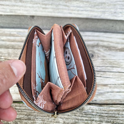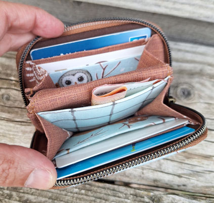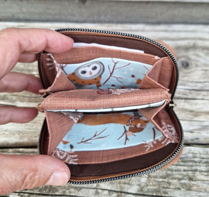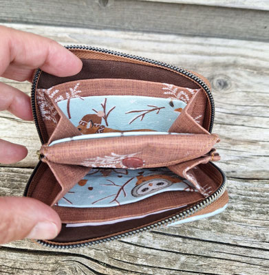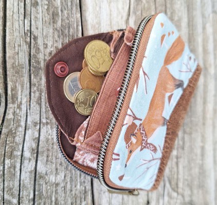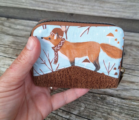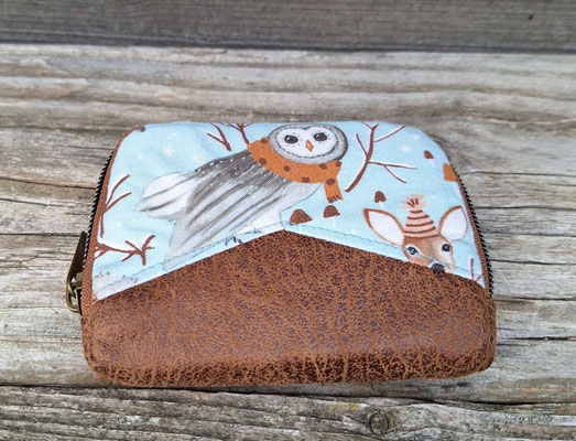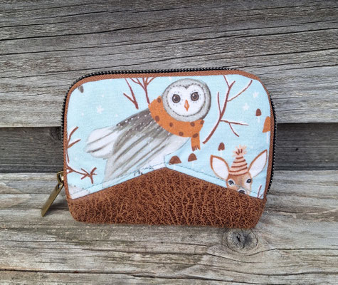 portefeuille minimaliste pour femme en faux cuir camel et tissu bleu clair avec un renard et une chouette