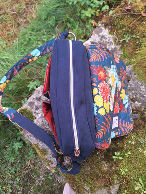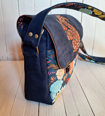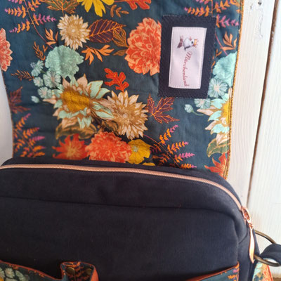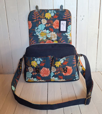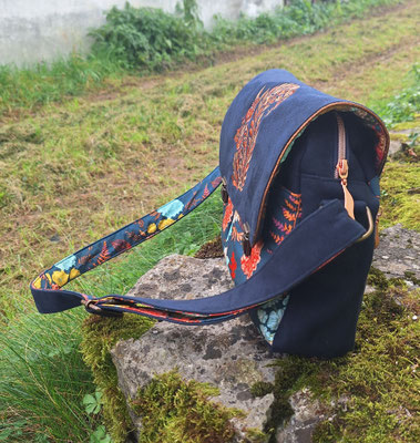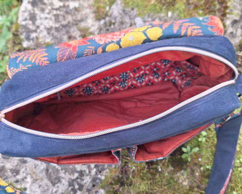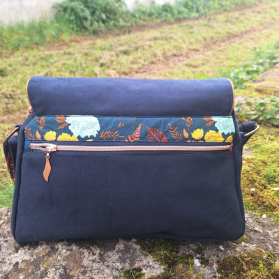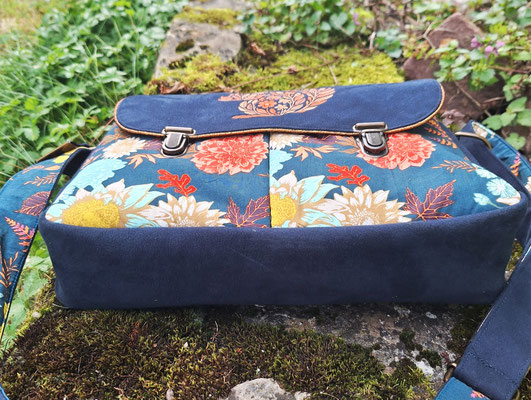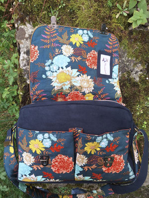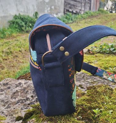 • L'extérieur du sac est en faux cuir bleu marine effet daim  ainsi qu'en tissu en coton bleu marine avec des fleurs et des fougères colorées.