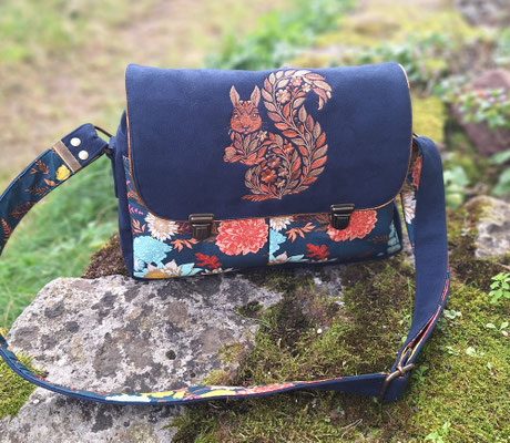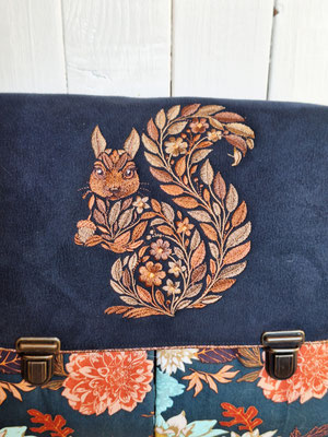 grande besace cartable pour femme en faux cuir bleu marine, tissu avec fleurs et fougères, broderie écureuil