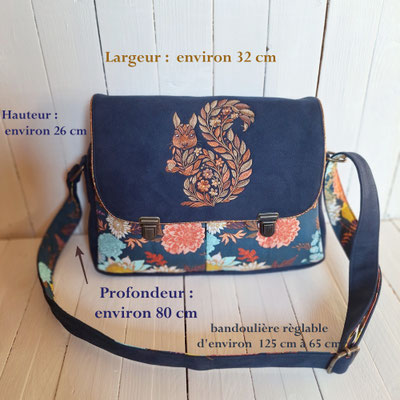besace cartable brodée femme- sac à bandoulière broderie écureuil en automne - faux cuir bleu marine - tissu en coton bleu marine avec fleurs et fougères colorées - artisanat français