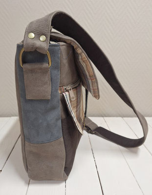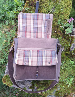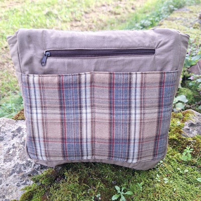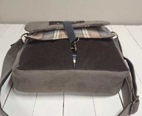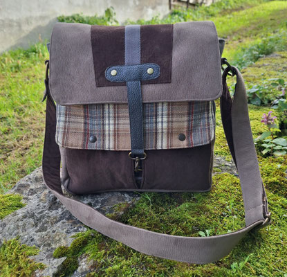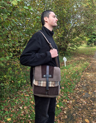 besace originale pour homme en faux cuir taupe, velours marron et tissu tartan à carreaux beige, couleurs naturelles