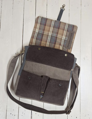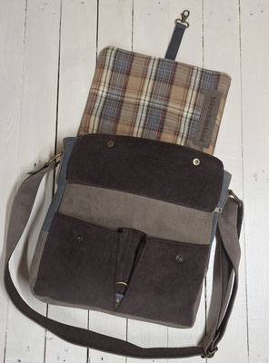 • L'extérieur est  en faux cuir taupe et gris, envelours milleraies marron et tissu tartan à carreaux beige.