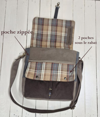 •  l'intérieur est en coton uni taupe et  en tissu tartan à carreaux beige.