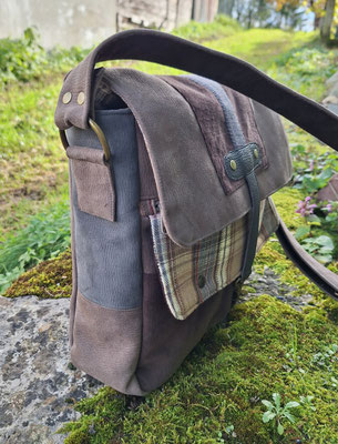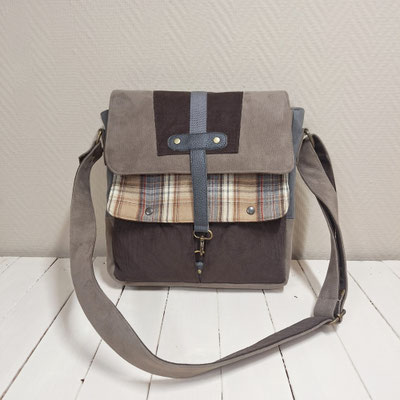 sac à bandoulière homme, besace unique original multimatière, faux cuir taupe, velours milleraies marron, tissu à carreaux tartan beige, cadeau unique pour homme