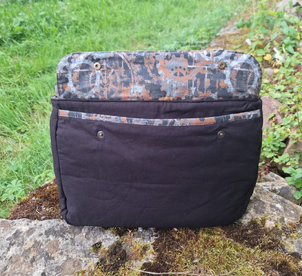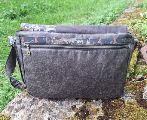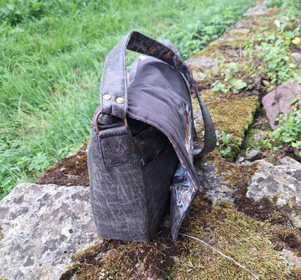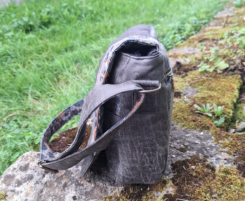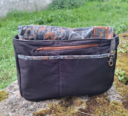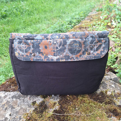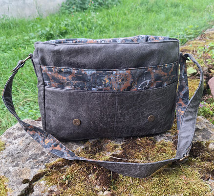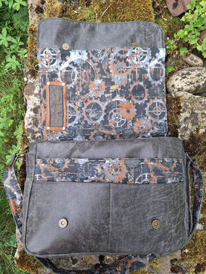 - L'extérieur de cette besace est en faux cuir anthracite, en tissu gris foncé avec des rouages et en toile de coton grise.